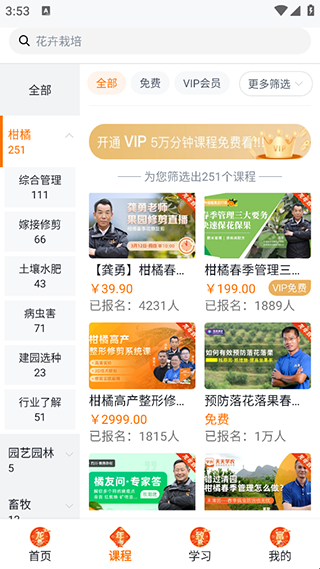 2、点击“课程”,里面有很多农业相关的课程