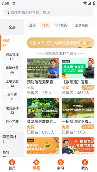 3、想要免费学习农业知识,可以选择上面的“免费”选项