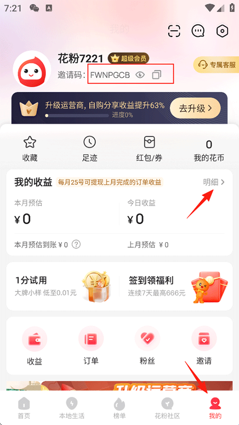 4、接着您可以在我的-复制个人昵称下的邀请码,新人登录使用你的邀请码也可获得收益,再点击明细;
