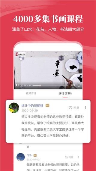 1、4000多集书画课程:涵盖了山水、花鸟、人物、书法四大部分。