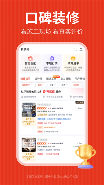 1、口碑装修:严审品牌资质,只收录业主好评的装修公司,你可以放心挑选。