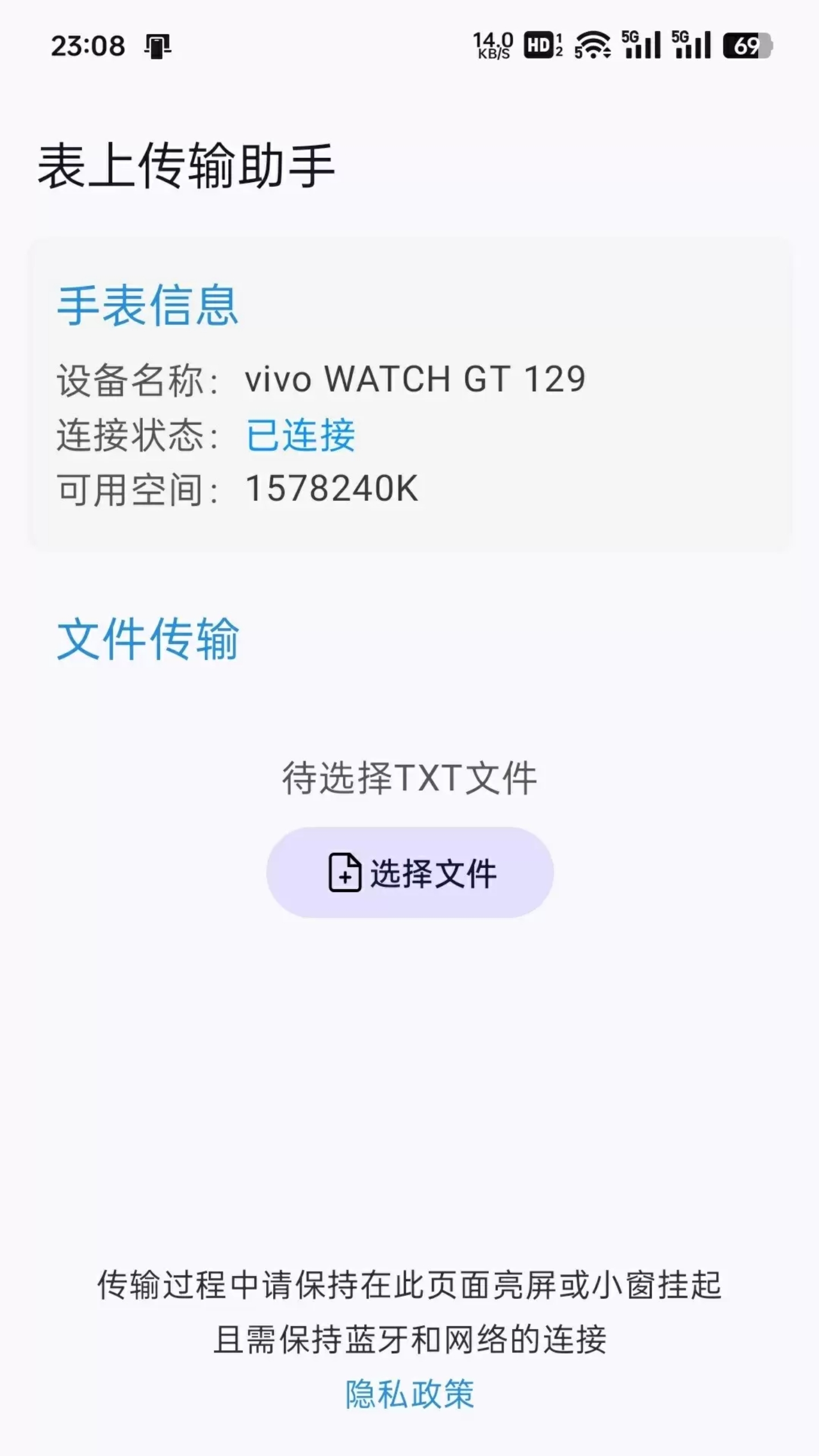 界面超级简洁的一款手机传输文件到手表的工具,表上传输助手app可以轻松连接vivo手表,支持快速传输笔记,传输txt文档小说,还有多种图片格式传输,操作方便,完全免费易用,有需要给手表传输内容的朋友必备。