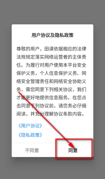 1、点击打开田课app,点击同意隐私政策