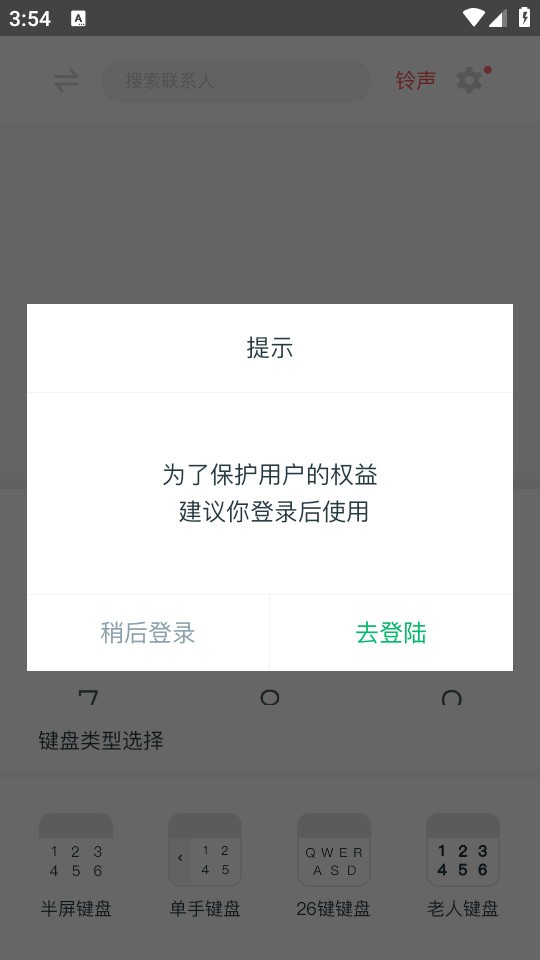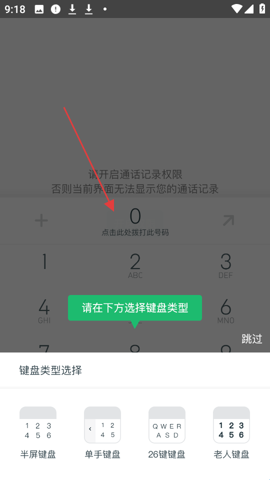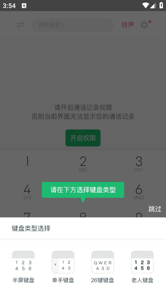 1、打开APP,若提示请开启通话记录权限,按指引前往设置开启权限,返回后选择键盘类型,如半屏、单手等键盘,继续操作。
