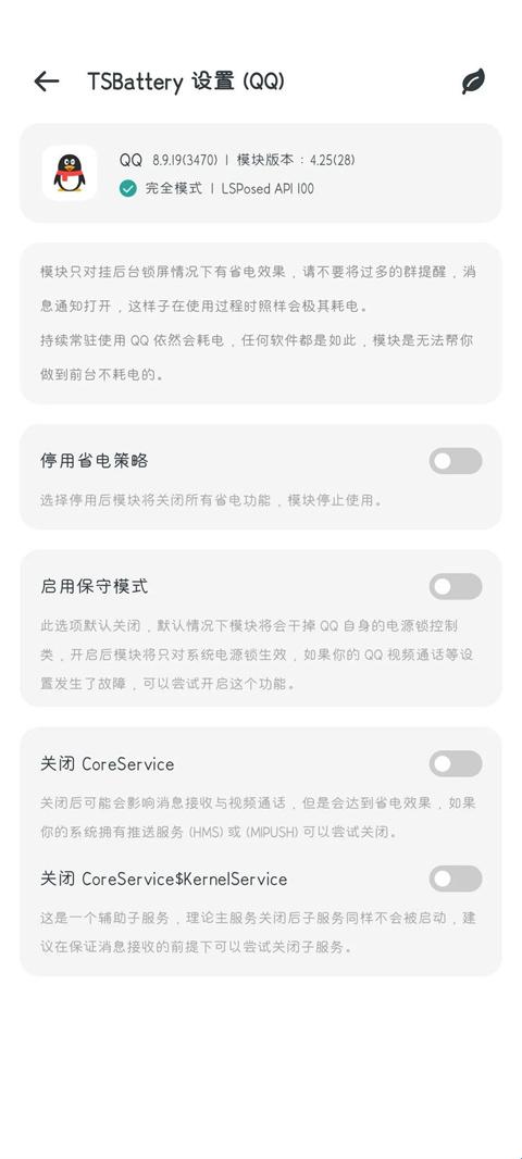 tsbattery是一款QQ省电模块,专为、QQ和TIM软件打造的省电模块,用户们可以借助该软件一键优化后台耗电活动和停止无用推送,拦截垃圾信息内容,操作起来也是非常简单的,激活后会显示叶子图标,激活后无需重启手机,正常使用就好了,感兴趣的小伙伴们快来下载tsbattery体验吧!