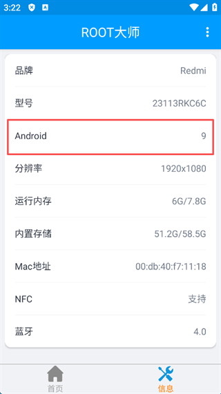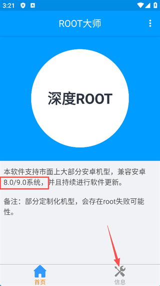 1、进入软件,首先需要查看该软件适用于大部分安卓机型,兼容安卓8.0和9.0系统,点击屏幕右下角的“信息”。
