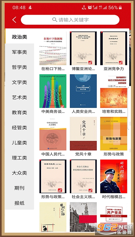 看书页面,内容分为十二大类,分别是:政治类、军事类、哲学类、文学类、艺术类、教育类、经管类、儿童类、理工类、大众类、期刊和报纸。
