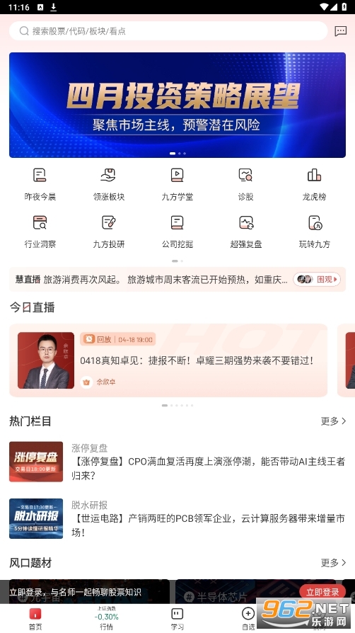 九方智投旗舰版app中会有老师进行直播,对当日行情的分析和判断,并与广大股友一起交流炒股心得,这些前辈们的经验和心得可以说对于新手股民的帮助还是比较大的,大家可以分析老师们的话,结合自己实际情况进行操作,保证自己能够在投资者获得实际的收益回报。