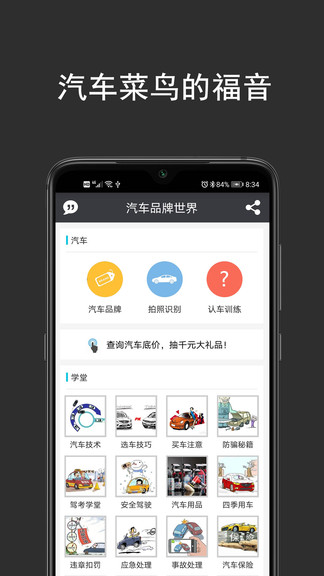 收录400多个汽车品牌的app,各种汽车场景知识干货,猜一猜,认车标,认名车主要功能包括汽车品牌、用车场景、认车训练、世界品牌、汽车工具箱等。