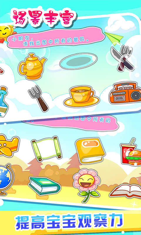 ·第四关将培养孩子各项综合能力,将对通过综合的物品来全面的考验孩子的认知理解分类和辨别能力。