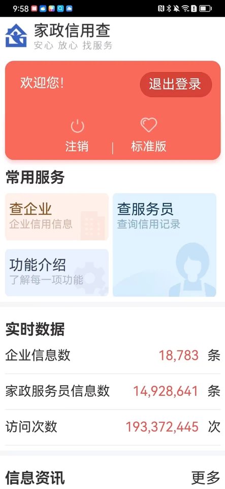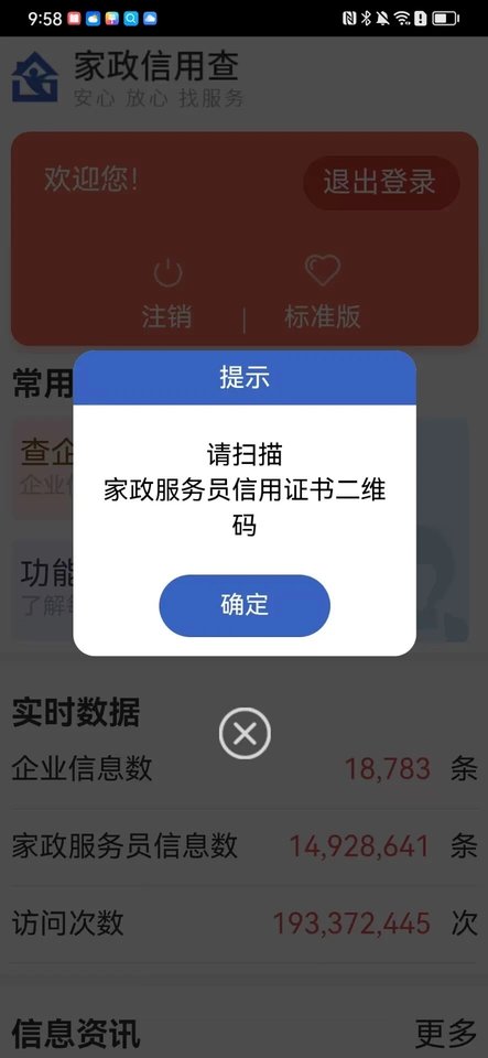 家政信用查(消费者端)APP主要面向消费者:消费者可通过家政信用查APP浏览家政行业各类资讯信息,可查询浏览家政企业公开信用信息,注册、登录后可通过扫描二维码(见家政服务员信用查询证书),经授权查看家政服务人员信用信息。