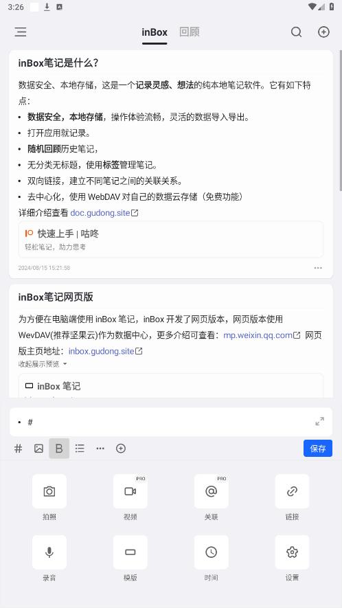 inBox是一个彻底的Android本地化卡片笔记软件,参考了flomo的设计。