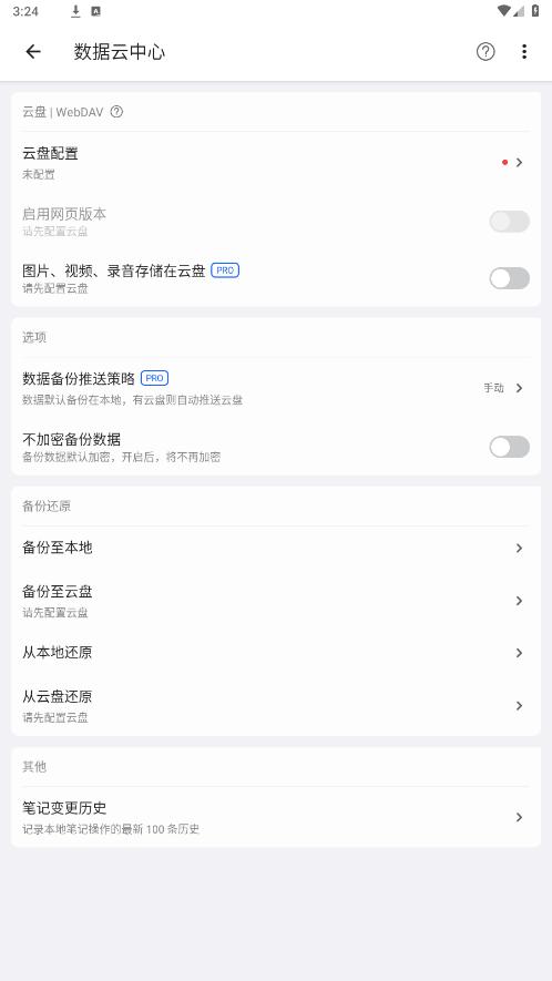 inBox很重视数据安全,所以提供了数据导入导出,并且提供了WebDAV云同步,具体要进行数据备份同步,可以点击首页顶部更多按钮,选择数据云中心进行操作。