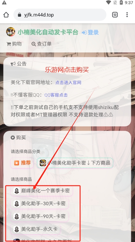 5、在跳转的小楠美化自动发卡平台中,选择你要的卡密套餐,支付相应费用,完成卡密的获取。