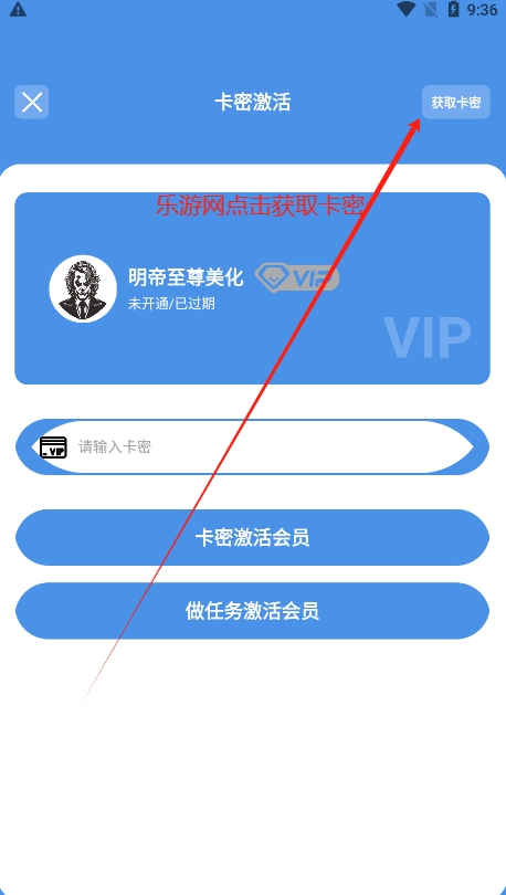 4、在卡密激活的页面中,点击右上方的“获取卡密”选项。