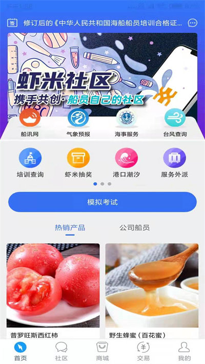 虾米社区app是一款集购物-新闻资讯为一体的软件,用户可以在这里看到一些商品包括促销的一些食品,还可以做到很多事情,比如查询当日航海船只信息,船员考核以及模拟考试,另外还有很多航海资讯等您发现,喜欢的可以下载看一看。