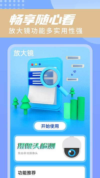 畅享随心看app是一款非常好用的生活服务工具软件,在软件上面有着非常多的功能,用户们可以在线进行使用,这里可以帮助用户们来放大字体,而且还能检测摄像头,上面的功能打开即可使用,非常的方便,有需要的朋友们快来下载体验吧!