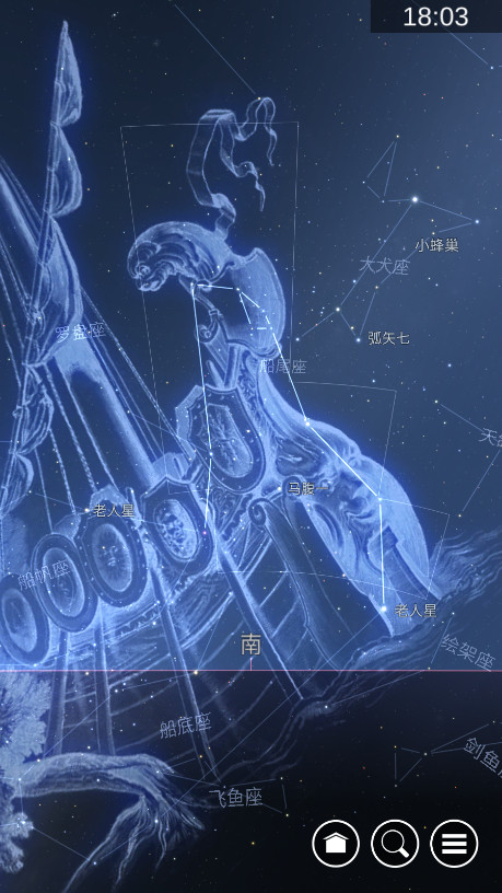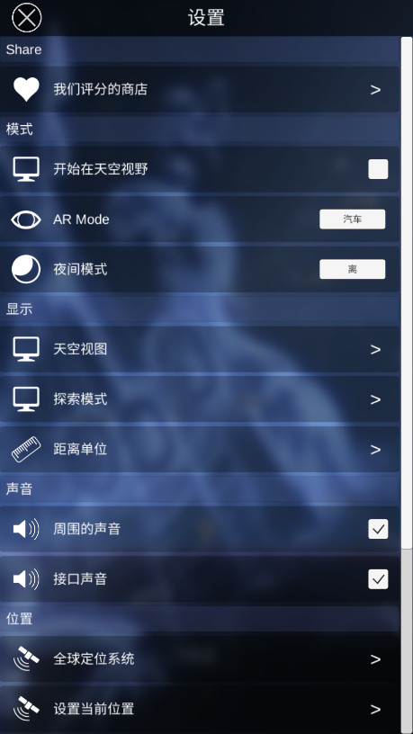 2.Star Chart 利用设备的指南针、GPS、加速计和陀螺仪,实时计算每颗行星和可见星的当前位置,为你精确显示在夜空中的位置。