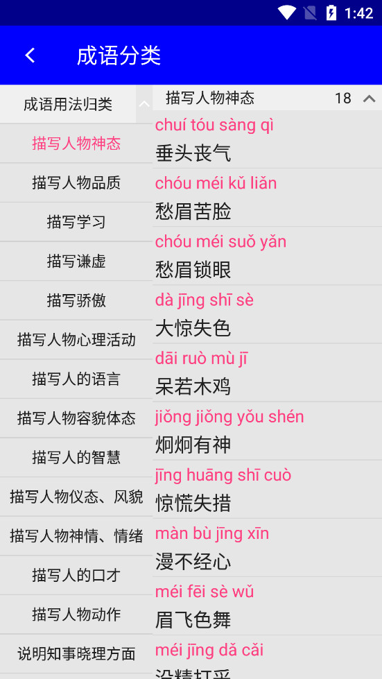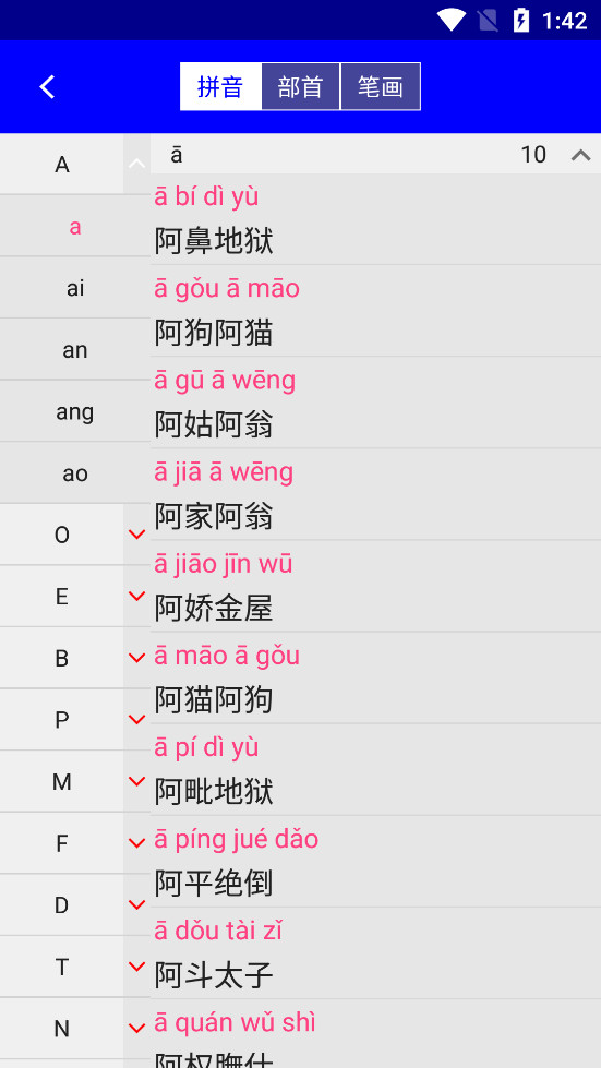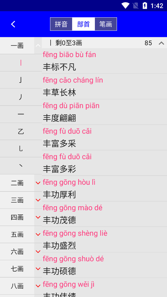 2、特别支持按成语首个汉字的拼音、部首、笔画数进行索引查询,且可自主灵活切换。
