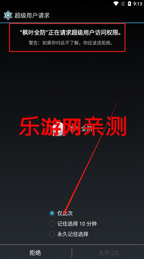 枫叶全防使用时,需允许应用获取超级用户访问权限并选择永久记住,再根据设备实际情况调试工作模式。
