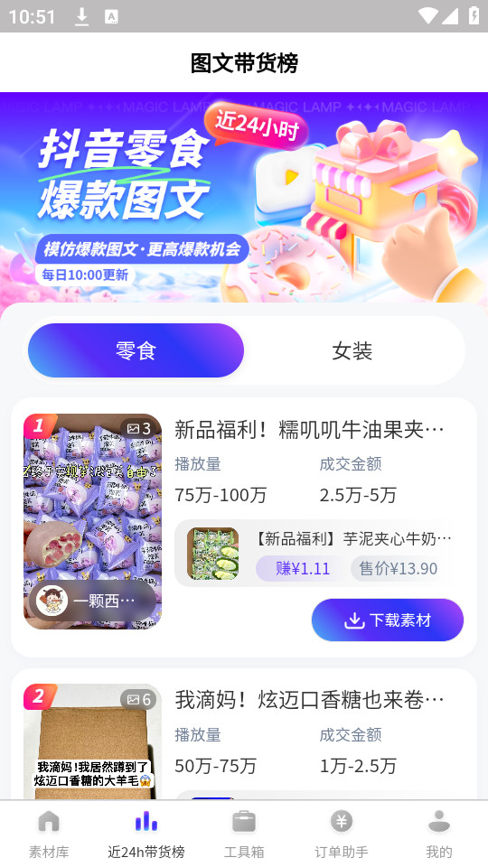 神灯素材助手,为达人提供一站式图文创作解决方案,包含海量免费原创高清素材和图片处理工具,是图文带货达人的得力助手。