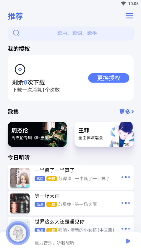 重力听听是一款专业、实用、便捷、优质的手机音乐在线播放助手软件,平台有着丰富多彩的音乐资源,支持全网曲库索引和搜索,用户可以搜索到各种中外流行歌曲以及一些不同类型的音乐和专辑。软件内没有广告,可以让用户不受广告干扰,更好地集中精力欣赏音乐和享受音乐~