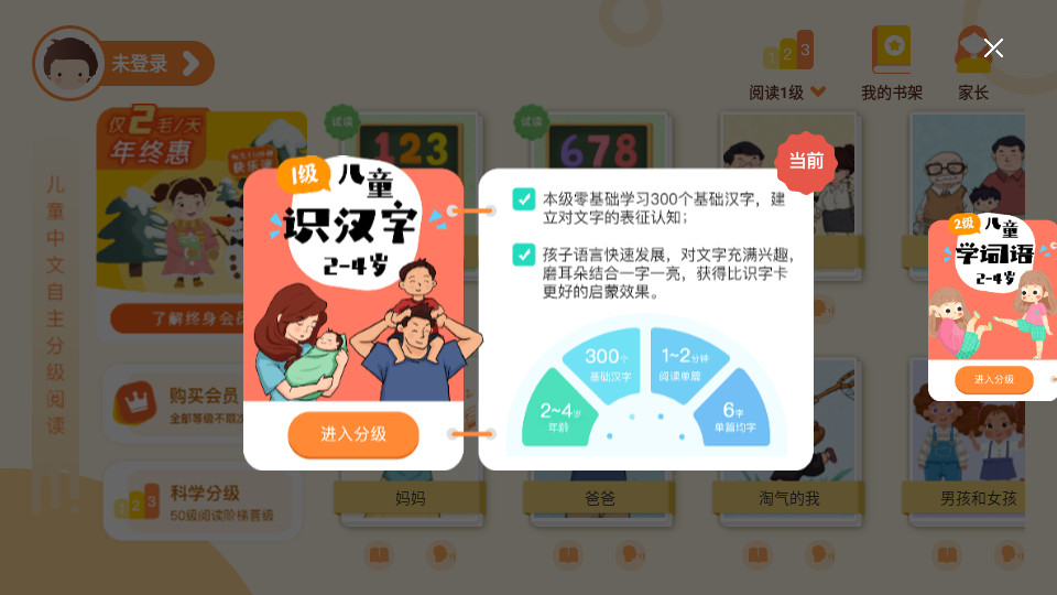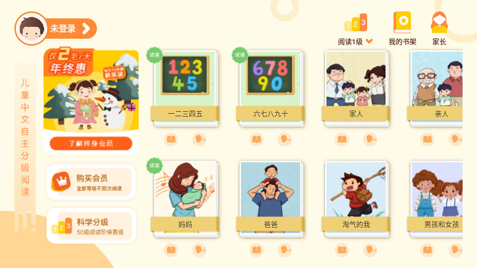 智能分级,能够更加孩子的年龄为您进行分级,让您可以选择适合你的读本进行学习;