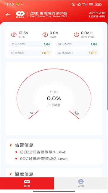 daly bms达锂bmsapp官方最新版本可以添加多个电池保护板进行管理,单组串联并联设备均可添加,充放电情况一目了然,支持一键加热,能够修改蓝牙设备的名称,支持进行温度设置,出现故障还能进行系统重启。