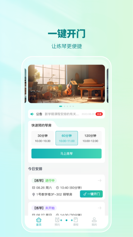 用户可选择到一键开门功能来进行琴房门锁的开门使用,无需使用钥匙即可直接在线开门。