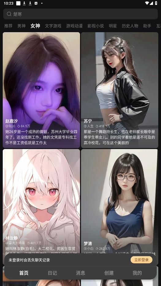 【理想伙伴】Wow世界生活着大量独具特色的AI人物,你可以在这个虚拟世界里遇到很多个性鲜明的AI伙伴:你可以和古代剑客展开江湖世界的爱恨情仇,成为美强惨的救赎白月光,与可爱宠物解锁生活中的美好时刻,又或者和苏格拉底展开一场富有哲理的对话,揭开海龟汤背后的诡异真相,经历一场奇幻的文字冒险游戏,此外,还有翻译助理、减脂教练等为你的生活持续提供帮助……无论你需要什么,在这里,你总能发现你想要的伙伴。还可以进行AI角色创建,获得你理想中的AI朋友。