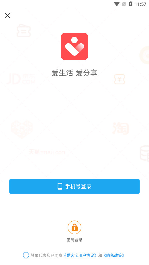 1、下载本网站的爱客宝app并打开,如图所示可以选择手机号登录/密码登录。