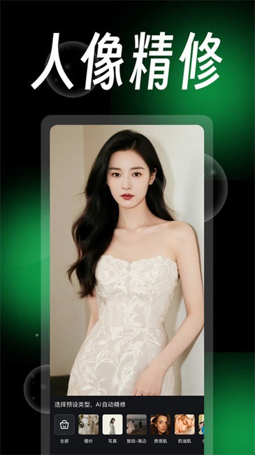 婚纱、写真、全家福、新中式、胶片、结婚照、闺蜜写真、质感肌、水光肌、祛瑕疵、原肤、磨皮等30多种潮流预设风格,打造专业级影像效果,高级大片一键呈现。