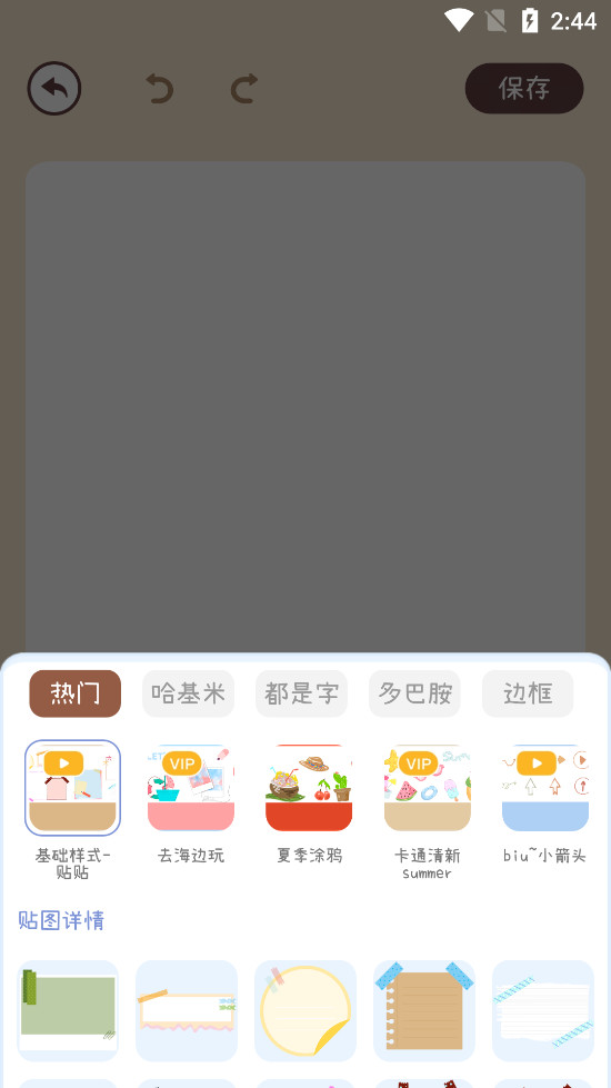 丰富素材:应用提供各种素材,包括贴纸、背景、字体、胶带和笔触等,让用户能够自由装饰手帐页面,创造出个性化的效果。素材库会经常更新,确保用户能够不断发现新元素,以丰富手帐的内容。