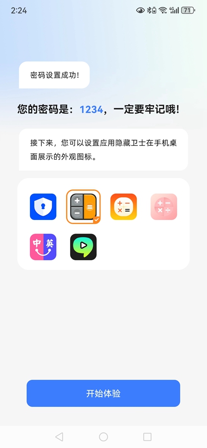 应用隐藏卫士启动密码,验证密码,只有输入正确的密码才能进入,有效保护您的隐私。