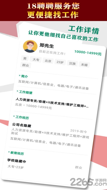 18聘聘——专业的找工作、求职、招聘软件.兼职、全职、实习、跳槽全行业覆盖.求职者与招聘者精准匹配,高速查看.随时随地,直接开聊.聊爽就约,拍板快,入职快.专业的人才网站,约5800万份工作等你来面试,祝您的前程无忧无虑.企业版正在孵化中.