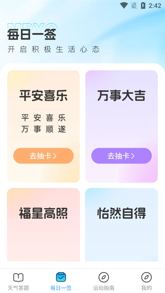 晴雨之间是一款融合趣味、励志与健康指导的多元化天气生活应用。在这里,天气不仅仅是温度的升降和云雨的变换,它是探索自然奥秘的窗口,是激发生活正能量的源泉,更是科学锻炼的贴心伴侣。