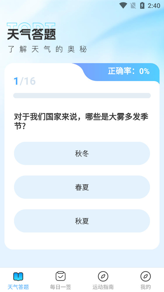 天气知识答题:厌倦了单调的天气查看?在“晴雨之间”,我们以趣味答题的形式,带你深入了解天气的奥秘。从气象原理到气候变化,每一道题目都是对知识的探索,让你在轻松愉快的氛围中增长见识,成为朋友圈中的天气小达人。