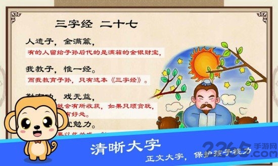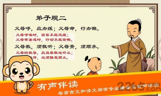 1.诵读易:国学启蒙,首先要以诵读为主,朗朗上口,其义自现.本软件所有典籍都配置拼音和诵读音频,以及文字赏析和介绍;方便孩子循序渐进,家长引导解释.