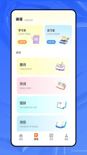 4、想学诗词就从底部导航进诗词页,那里有学习表和自习室还能选择唐诗宋词等类别来读呢。