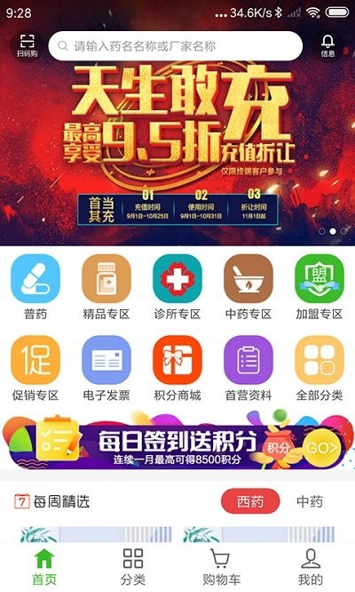 拥有常用的分类专区,在首页中能看到诊所专区、精品专区以及促销专区和普药专区等