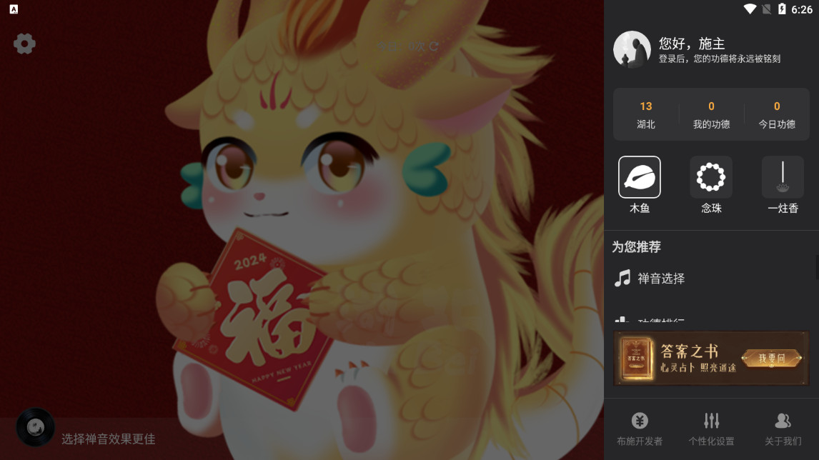 【音乐可选择】共有16种禅音,免费更换,还可听佛经。