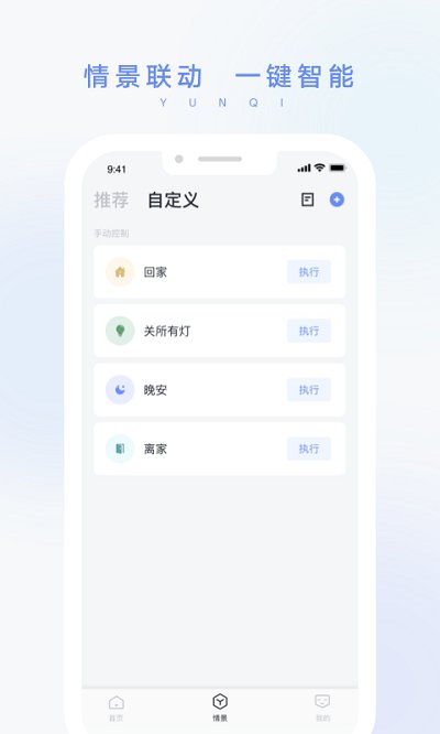 云启app是一款能够让你的生活更加智能舒适的管控服务平台。在这里,用户可以智能控制管理家中的设备,通过智能的场景设置,一键可以控制多个设备的开关,致力于让你的生活更便利更舒适,还能轻松便捷地共享设备给家人,让全家人都能享受智能的生活。