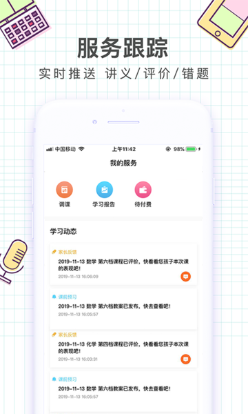 随时随地查看课程安排,方便2265学员课前预习、错题回顾以及查看课程报告,同时家长对我们教学服务进行反馈,零距离沟通;