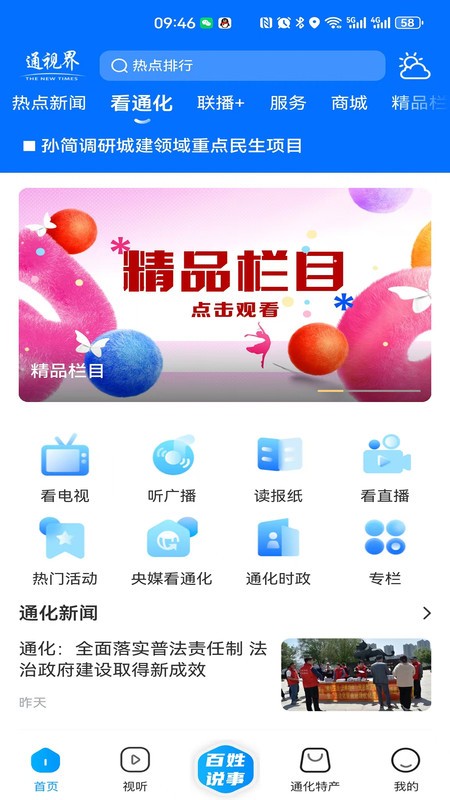 打开通视界,可以看到首页上方有着热点新闻、看通化、服务等板块内容。