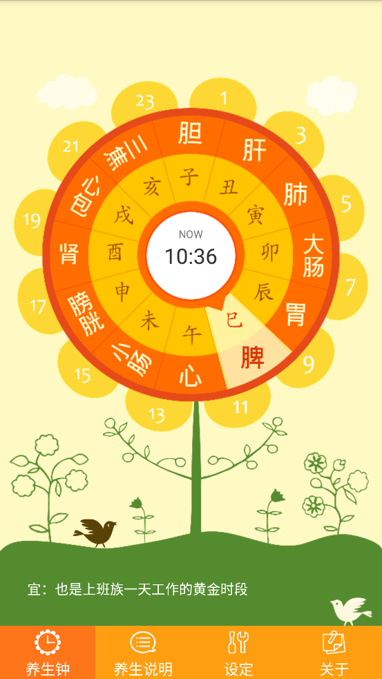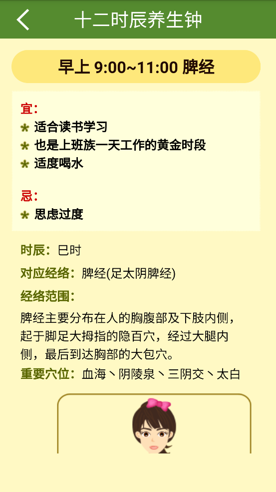 巳时(9:00-11:00):脾经当令,适合工作学习,保持心情愉悦。APP会推荐一些减压方法。