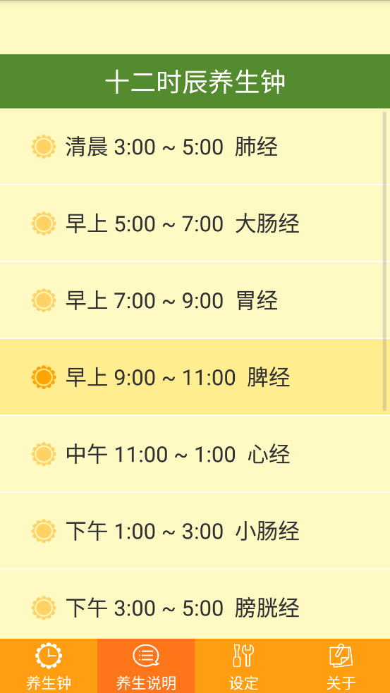例如下午1点至3点的时段是属于小肠经的时间,本软件将会提醒您这个时段适合泡杯茶多喝水以利排毒,更要切忌在这个时段憋尿,会影响健康。