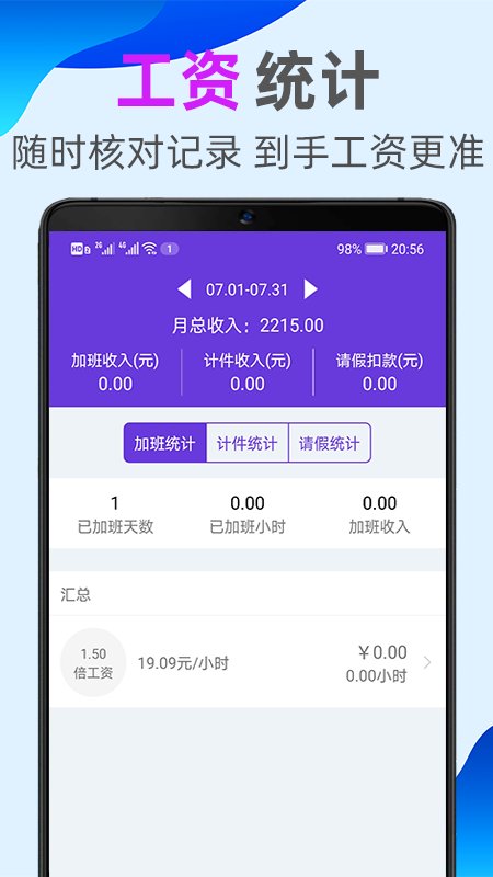 加班统计:你可以看到月总加班天数、总加班时间、总加班工资,计件记加班是你永不丢失的加班时间记账本;