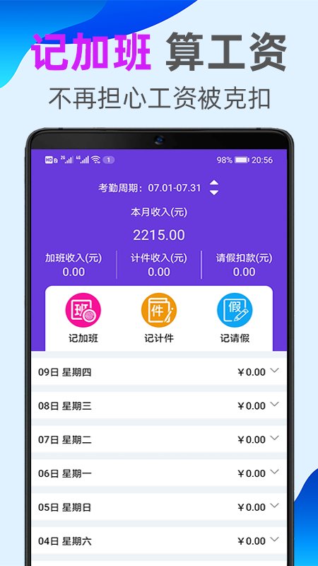 记录加班时间,快速计算工资,给自己的工时记账,让您看见自己的劳动成果。