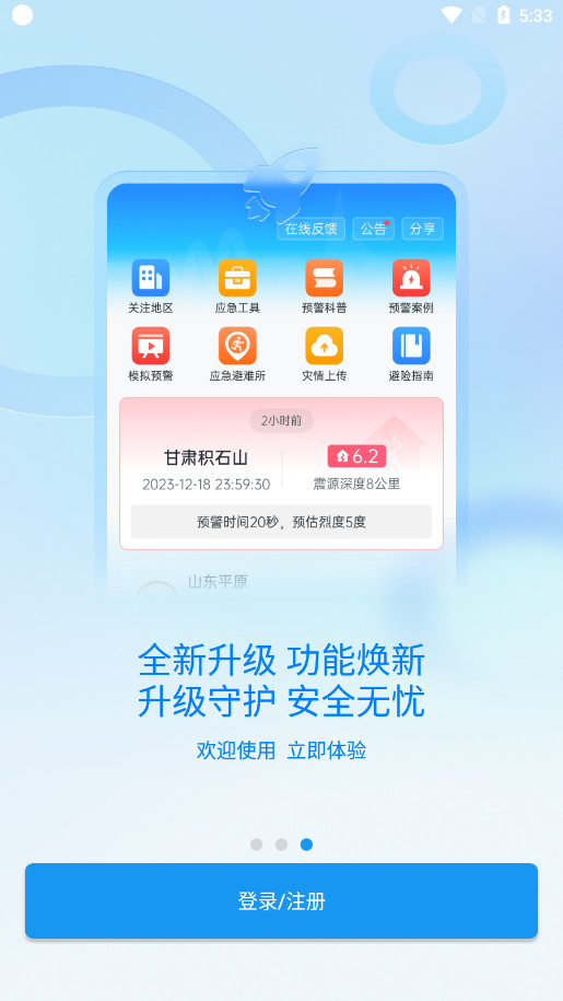 3.可在灾后上传避险反馈、灾情采集险情,以便精准救援;了解地震科普、预警声音、预警案例