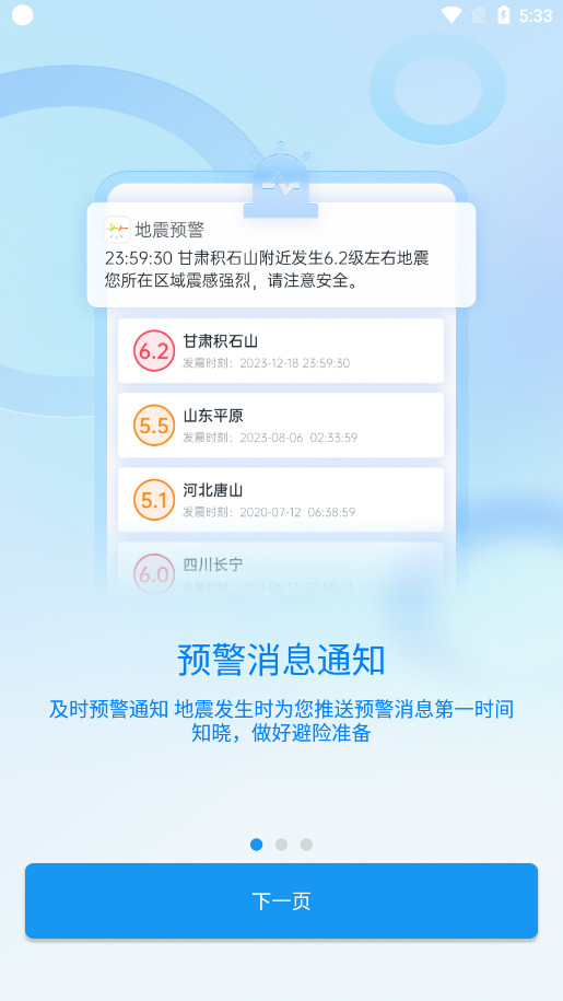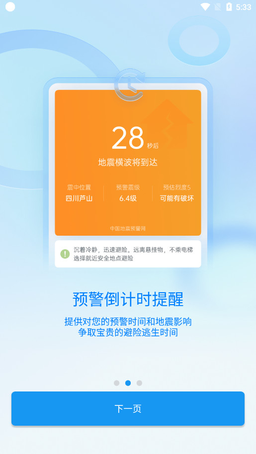 1.支持根据预警信息进行倒计时.发出声音或震动警报,以提醒用户及时采取正确的地震避险措施